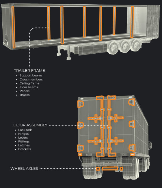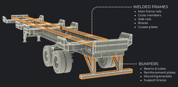 Hlavní nosníky (Main frame rails): Páteřní konstrukce návěsů.
