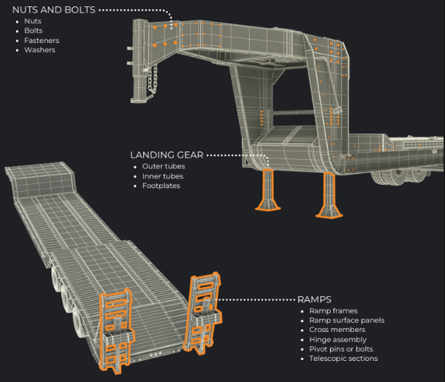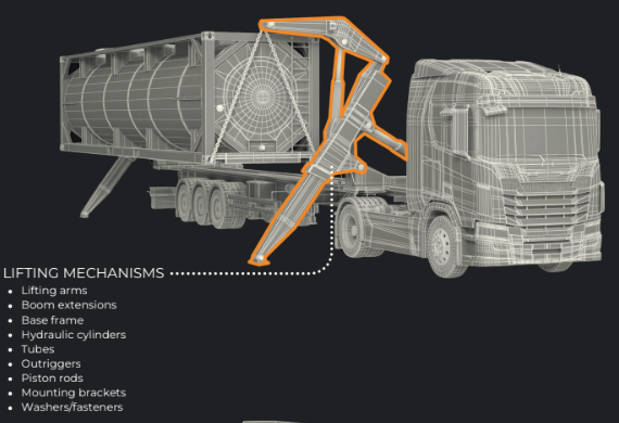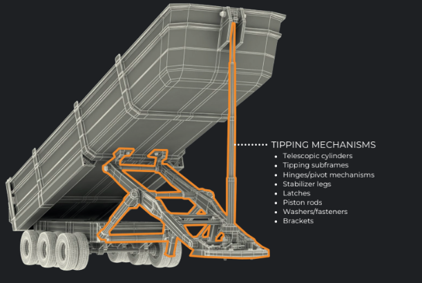 Sklápěcí mechanismy (Tipping mechanisms): Pomocné rámy a stabilizační nohy pro sklápěče.