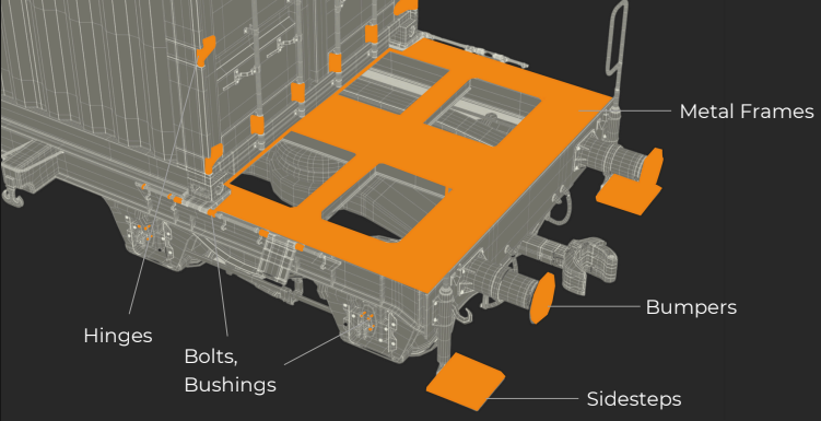 Boční rámy (Side Frames): Masivní ocelové prvky podvozků.